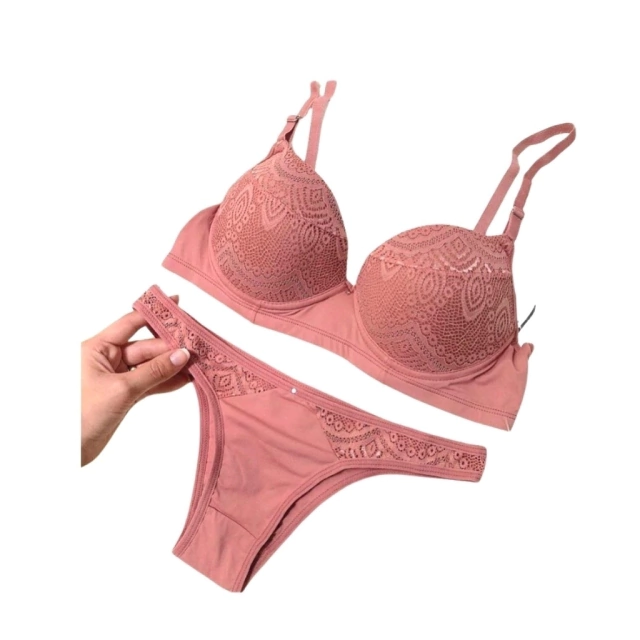 Composto por um sutiã push-up e uma calcinha tanga, ambos em microfibra e renda, este conjunto é confortável, durável e proporciona um ajuste perfeito ao corpo. Sua cor rosa trás o ar de romantismo e elegência!